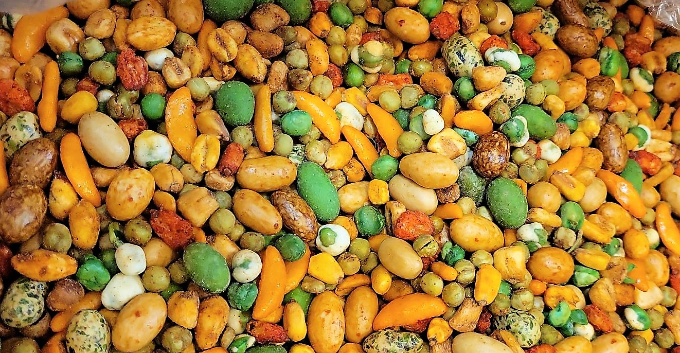 Peas, Salt, Palm Oil, Artificial Colors: FD&C Yellow No. 5 & Blue No.1, Peanut Nut Snack- Peanuts, Wheat Flour, Sugar, Rice Flour, Tapioca Starch, Chinese Seasoning (chilly powder tomato powder, black pepper.