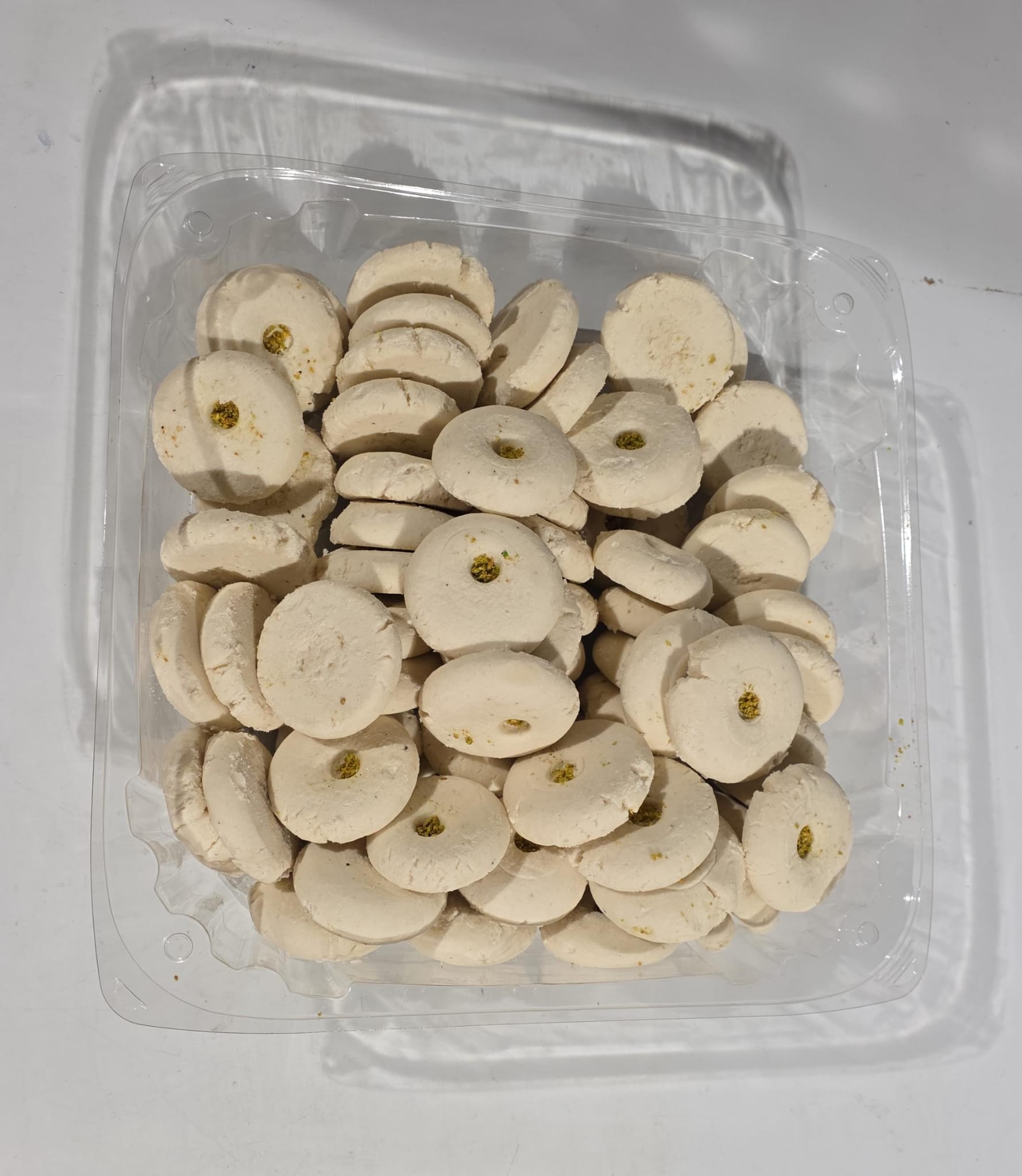Appearance: Round, flat cookies, often topped with chopped pistachios.